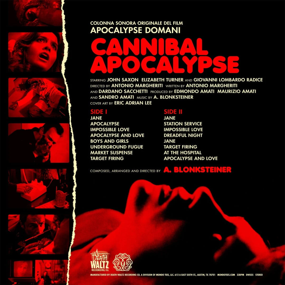 Death Waltz Recording Company has taken another step into the infamous genre of flesh-eating monsters in order to bring you a much-requested score from the field of Italian horror – Alexander Blonksteiner’s CANNIBAL APOCALYPSE (aka APOCALYPSE DOMANI). Directed by Antonio Margheriti (YOR, HUNTER FROM THE FUTURE) and starring John Saxon (A NIGHTMARE ON ELM STREET), APOCALYPSE is a nightmarish vision where two Vietnam vets – Saxon and infamous horror actor John Morghen – unleash horror upon the world via a virus that makes the infected want to consume human flesh.