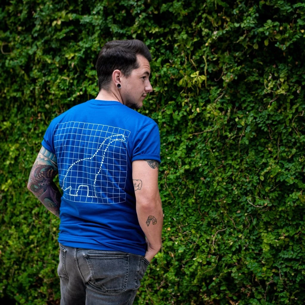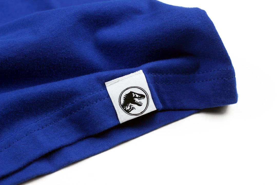 Printed by Impact Merchandising on Next Level 3600 royal blue tee, available in unisex sizes XS-4XL. Includes an official Jurassic Park hem tag and printed interior neck label.