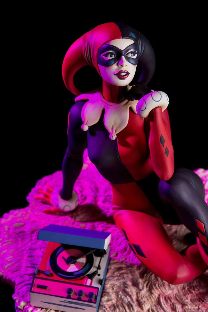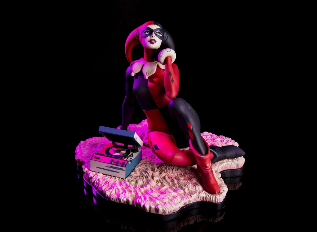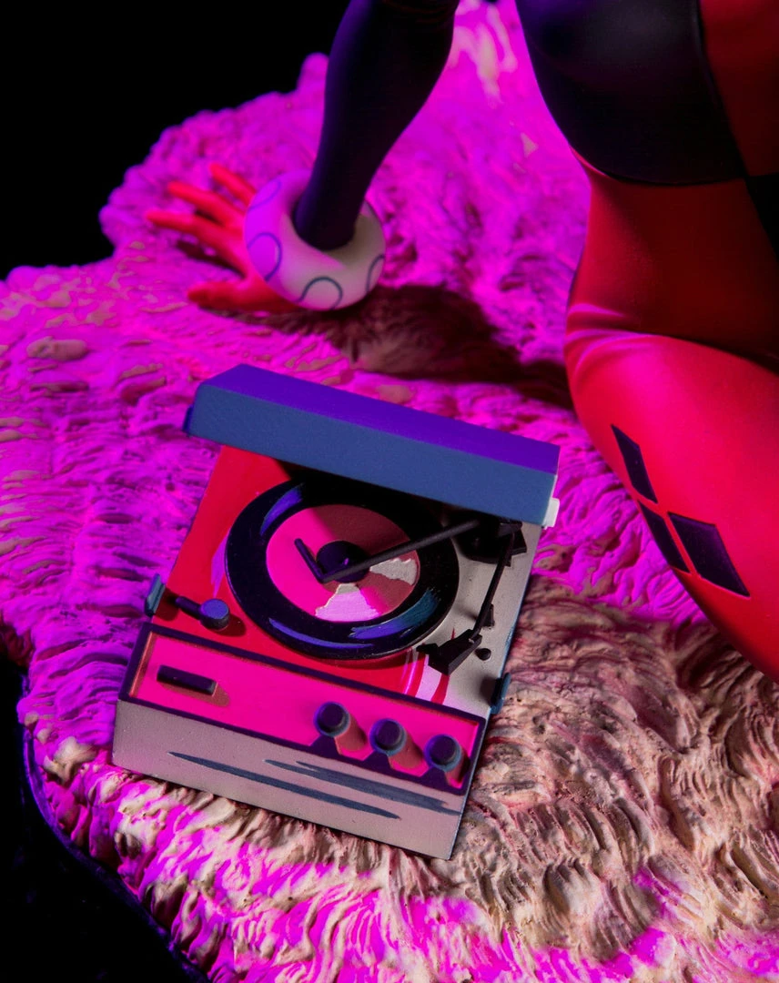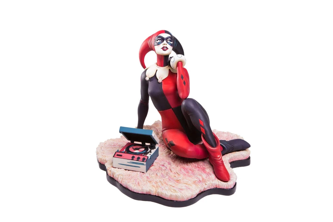 Based on the poster and 7″ vinyl record sleeve by Matt Taylor, the Waiting for My J Man statue features a lovelorn Harley Quinn, relaxing on a swanky shag carpet while listening to her favorite tunes, as she waits for a certain someone to come home.
