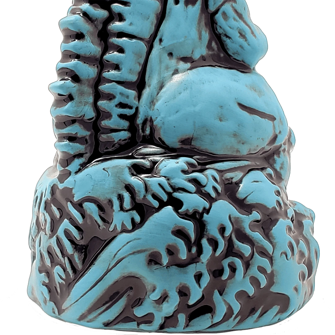 Rising from the waves off the Tokyo coast is pop culture’s preeminent prehistoric powerhouse himself, the gargantuan GODZILLA. As tribute to seven decades of sheer reptilian wrath, artists Hector Arce, Mike Bonanno and Tufan Sezer have tiki-fied cinema’s most iconic lizard for the first time in history, in homage to the battle-heavy, blood-soaked 1974 fan favorite GODZILLA VS. MECHAGODZILLA. Perched upon a Pacific tsunami and ready to annihilate his destructive digital doppelgänger (but just as ready to provide you with radioactive refreshment), the GODZILLA ’74 Tiki Mug is a monumental masterwork of dinosaur drinkware fit for a king.