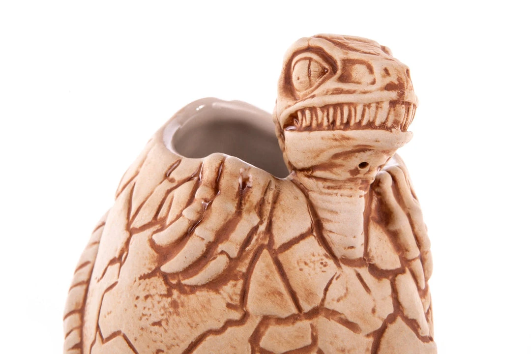Life finds a way… to drink! Hatched in the labs at InGen, the Baby Raptor wants to share her shell with you for a delicious tropical drink. This species of mug holds approx.16 oz, and features the baby raptor breaking through her shell, sitting atop her nest, with the Jurassic Park logo embossed underneath. Say the magic word, and add this mug to your paddock today!