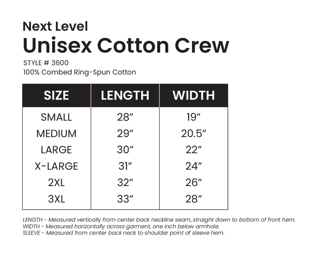 Printed by Impact Merchandising on a Next Level 100% cotton white tee with printed interior label.