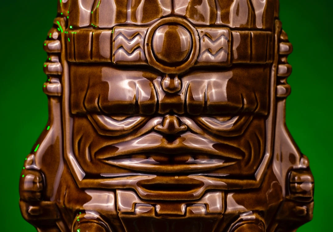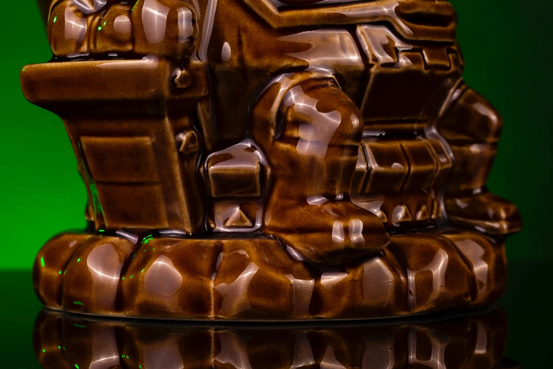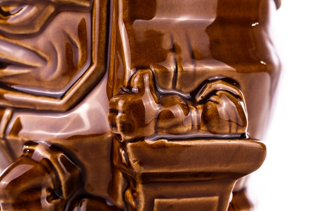 This Alamo edition of the MODOK Tiki Mug features a reactive brown glaze on stoneware ceramic!