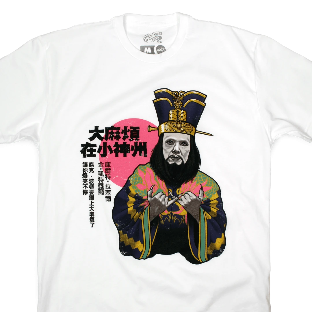 Here’s what ol’ Jack Burton always wears at a time like this. Paige Reynolds of Phantom City Creative has a particular eye for clever design, and her new illustration for BIG TROUBLE is no exception. She’s taken Jack Burton’s infamous tank-top design and added an ingenious twist – swapping out the nameless character for his greatest foe, Lo Pan! The faithful rendering, touch of texture, and muted color palette give this shirt the feel of a well-loved artifact from the 1980s.