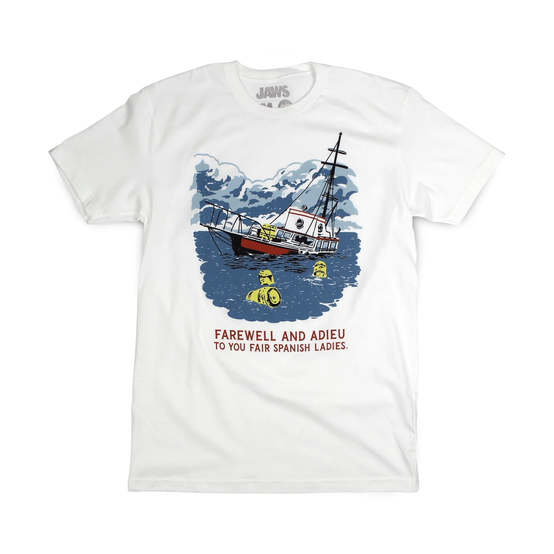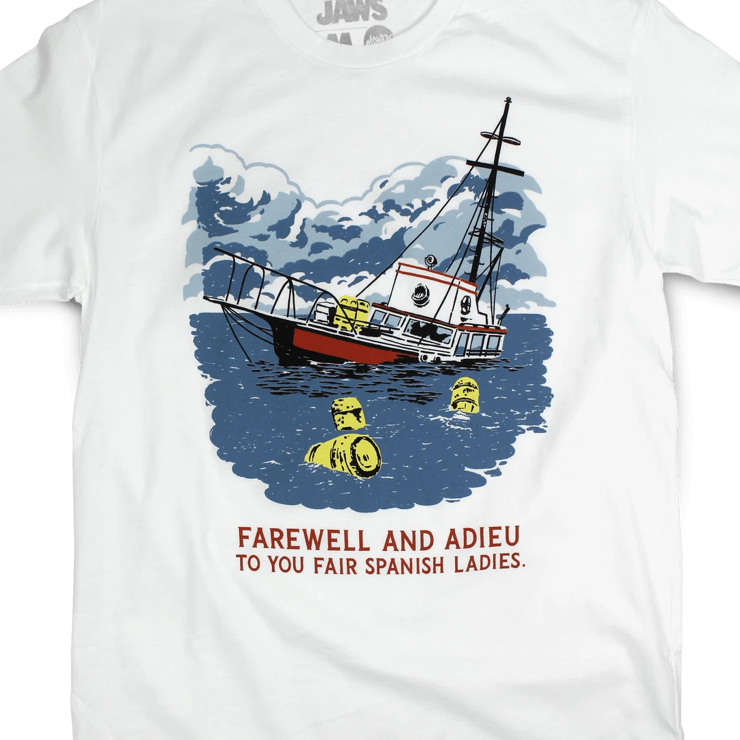 Artist Ryan Duggan’s colorful, elegiac design salutes the good – though doomed – ship Orca, and the final showdown between man and shark as seen in Steven Spielberg’s 1975 blockbuster, JAWS. His design is punctuated by a verse from salty sailor Quint’s mournful sea shanty.