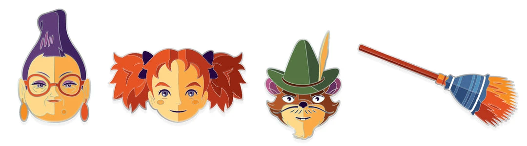 4 piece enamel pin set designed by Tom Whalen. Contains the Mary Enamel Pin, Broomstick Enamel Pin, Flanagan Enamel Pin and Madam Mumblechook Enamel Pin.