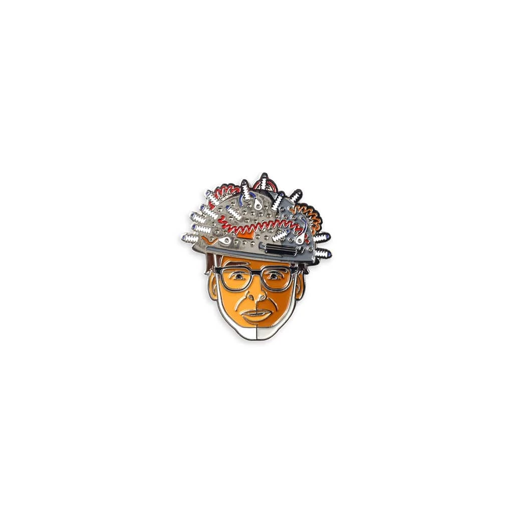 1.25″ high soft enamel pin designed by Tom Whalen. Single post on shiny silver metal with a butterfly clutch backing